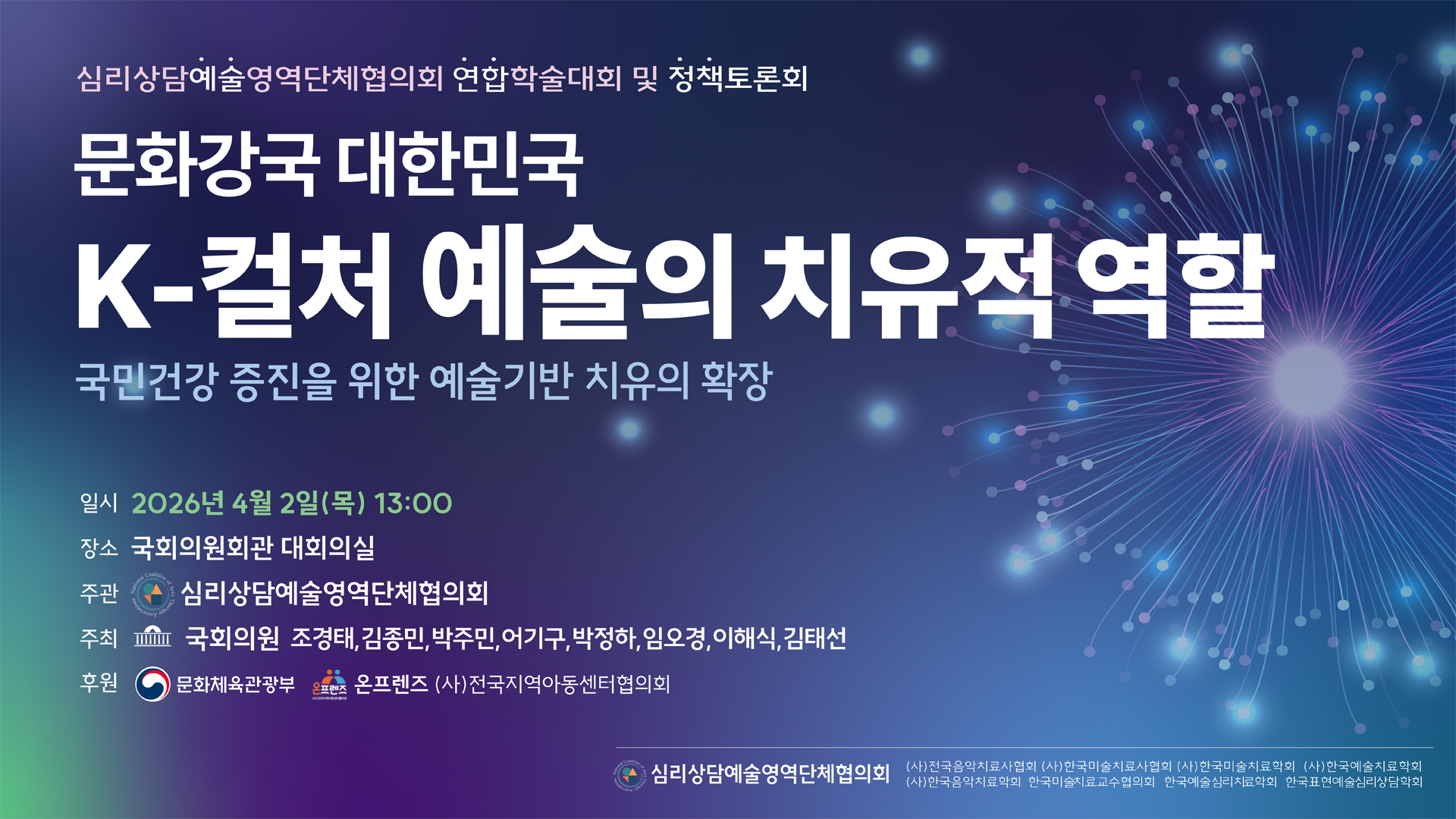 오는 4월 2일(목) 오후 1시 국회의원회관 대회의실에서 ‘문화강국 대한민국, K-컬처 예술의 치유적 역할’을 주제로 한 연합학술대회 및 국회 토론회가 개최된다.